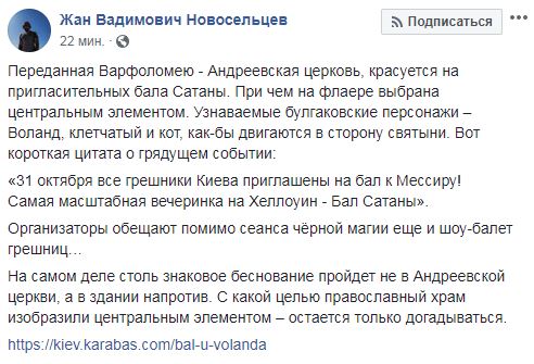"Переданная Варфоломею - Андреевская церковь, красуется на пригласительных бала Сатаны. При чем на флаере выбрана центральным элементом. Узнаваемые булгаковские персонажи - Воланд, Клетчатый и Кот, как-бы двигаются в сторону святыни", - пишет Жан Новосельцев в Facebook. Он ссылается на организаторов, которые обещают помимо сеанса черной магии еще и шоу-балет грешниц.