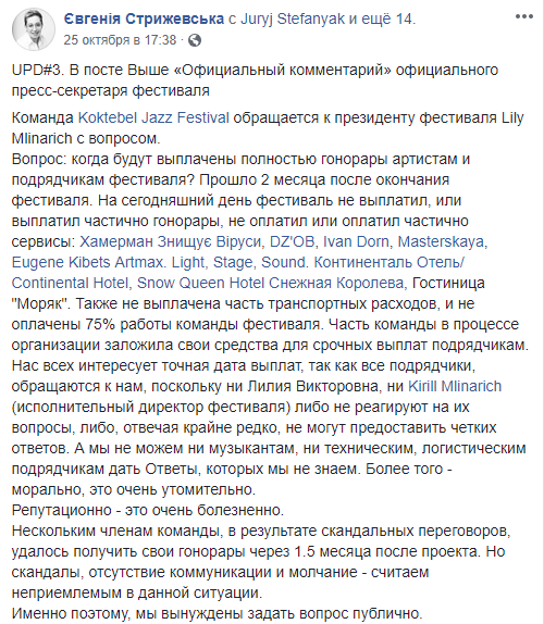 "На сегодняшний день фестиваль не выплатил, или выплатил частично гонорары, не оплатил или оплатил частично: Хамерман Знищує Віруси, DZ'OB, Ivan Dorn, Masterskaya, Eugene Kibets Artmах, Light, Stage, Sound, Continental Hotel, Snow Queen Hotel и гостиница "Моряк". Также не выплачена часть транспортных расходов, и не оплачены 75% работы команды фестиваля", - сказано в сообщении.