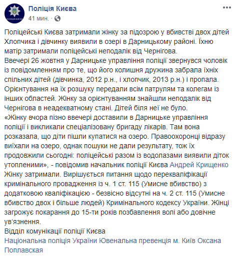 Полицейские задержали женщину, которая подозревается в убийстве своих детей. Пропавших вчера на Дарнице мальчика и девочку их мать утопила в озере, которое расположено в этом районе Киева. Об этом в Facebook сообщает столичная полиция.