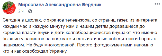 "Сегодня в школах, с экранов телевизора, со страниц газет, из интернета каждый час и каждую минуту нам и нашим детям дорвавшиеся до кормила власти внуки и дети коллаборационистов внушают, что именно бывшие у нацистов на подхвате и есть истинные победители и борцы с нацизмом".