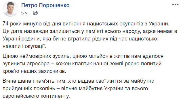 "Друзья! Сегодня День освобождения Украины от немецко-фашистских захватчиков! Поздравляю с праздником! Наши отцы и деды победили фашизм и мы победим! Сейчас другое время и другая война. Но тем значительнее будет наша новая победа!"