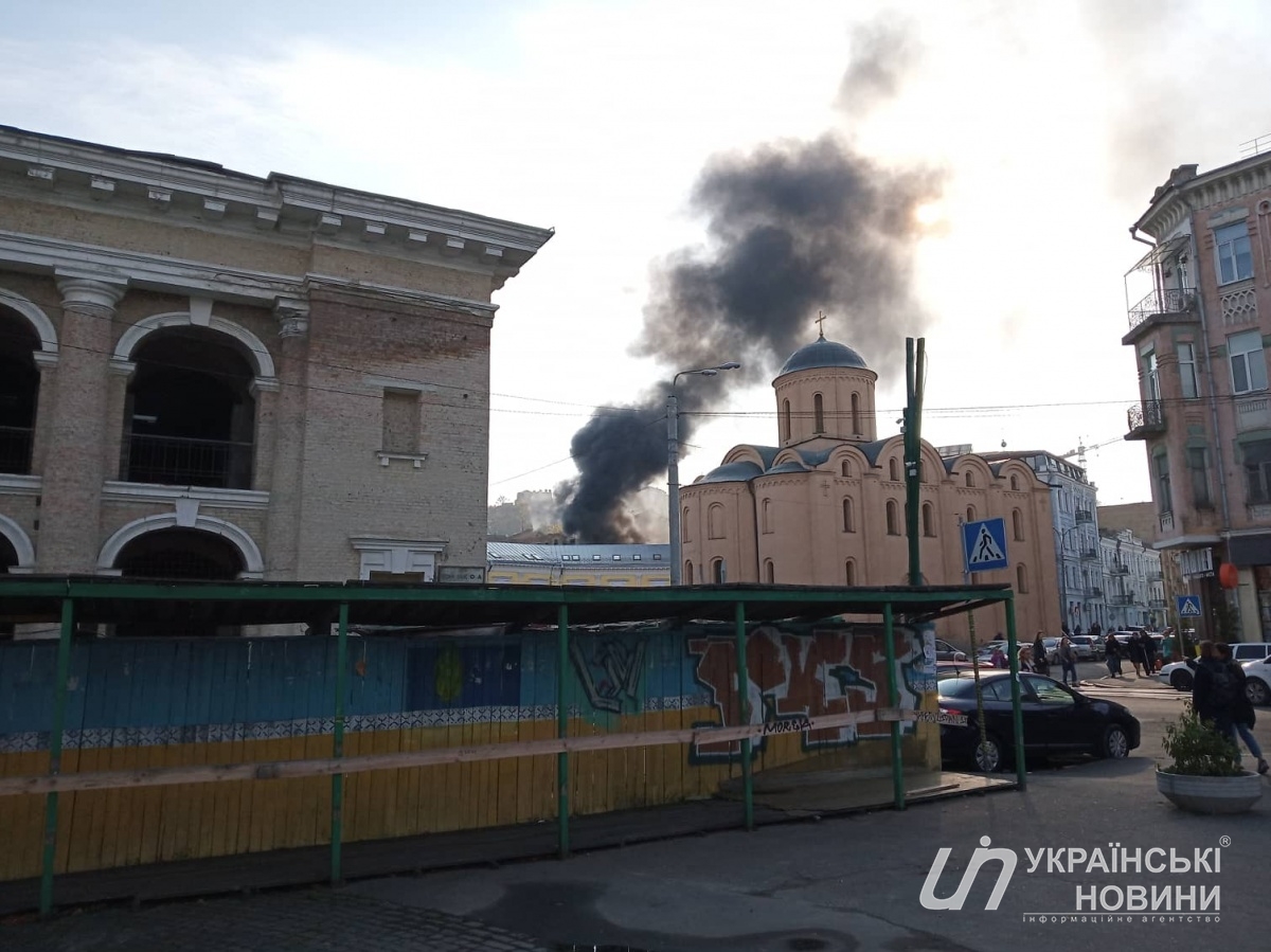 Пожар возник на столичной Контрактовой площади, Подольский район. На фото в сети видно, что пожар довольно сильный, о причинах возгорания пока неизвестно. Черный дым поднялся в воздух на высоту не менее ста метров.