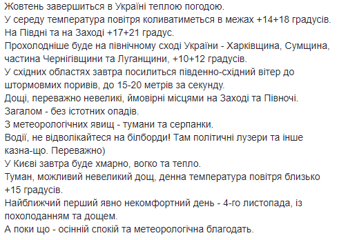 В восточных областях 31 октября юго-восточный ветер усилится до штормовых порывов, до 15-20 метров в секунду. Дожди, преимущественно небольшие, пройдут на Западе и Севере. В общем - без существенных осадков. В Киеве 31 октября будет облачно, сыро и тепло. Возможен туман и небольшой дождь, а дневная температура воздуха достигнет +15 градусов.