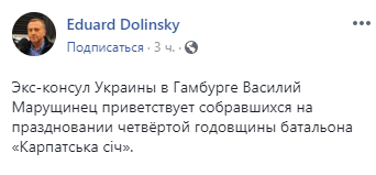 "Экс-консул Украины в Гамбурге Василий Марущинец   приветствует собравшихся на праздновании четвёртой годовщины батальона "Карпатська січ", - подписал он фото.