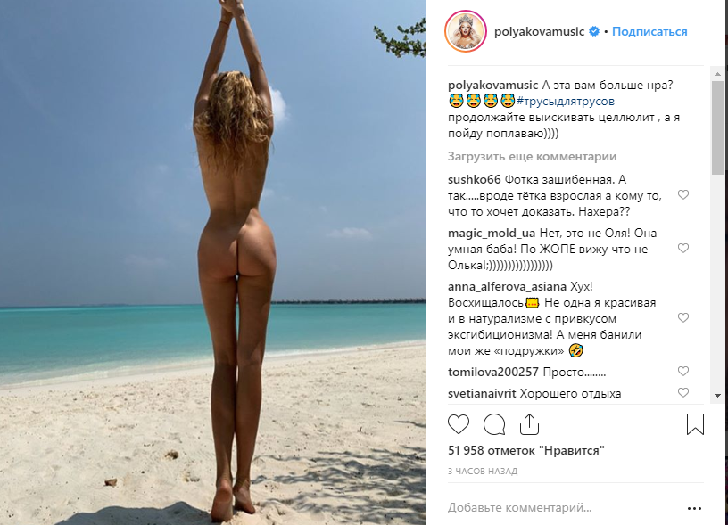 Пикантные фото с одного из пляжей на Мальдтвах певица подписала так: "#трусыдлятрусов доброе утро!". Другое фото увеличено. Оля написала, чтобы пользователи продолжали искать целлюлит, а она пойдет поплавает.
