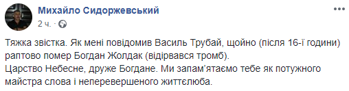 "Тяжелая весть. Как мне сообщил Василий Трубай, только что (после 16 часов) внезапно умер Богдан Жолдак (оторвался тромб). Царство Небесное, друг Богдан. Мы запомним тебя как мощного мастера слова и непревзойденного жизнелюба".