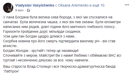 "У пана Богдана была большая седая борода, с которой мы спускались на санках. Была огромная чашка, из которой он пил океаны. Были километры написанных им строк, долгие часы его магического глубокого голоса... Горизонты пройденных дорог, миллиарды ступенек. Всем этим пан Богдан щедро делился с нами... Скорбная новость о его смерти подтвердила важную вещь - он стал вечностью.. Богдан Жолдак - крутой! И теперь это навсегда! Покойся с миром, Мастер! Вы с нами! Любим и обнимаем ВАС все вместе! И бесконечно благодарим за все, чему научили... Ваш староста Влад-Столица и вся творческо-драматургическая банда "Лабтрон".