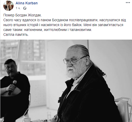 "Умер Богдан Жолдак. В свое время удалось с паном Богданом посотрудничать, наслушаться от него лестных историй и посмеяться над его баснями. Мне он запомнится именно таким: воодушевленным, жизнелюбивым и талантливым. Светлая память".