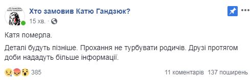В воскресенье, 4 ноября, умерла жертва нападения в Херсоне активистка Катя Гандзюк. Об этом стало известно из сообщения в Facebook-сообществе "Хто замовив Катю Гандзюк?", в котором общественность информировали о ходе расследования.