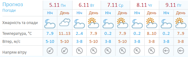 По данным Укргидрометцентра, в понедельник, 5 ноября, в Киеве пасмурно, днем +11...+13. Со вторника синоптики обещают переменную облачность, температура немного снизится до +7...+10 днем, со среды ночью термометры опустятся до 0...+2.