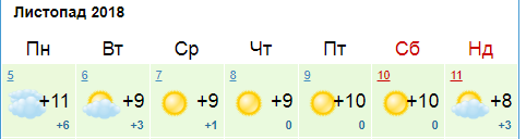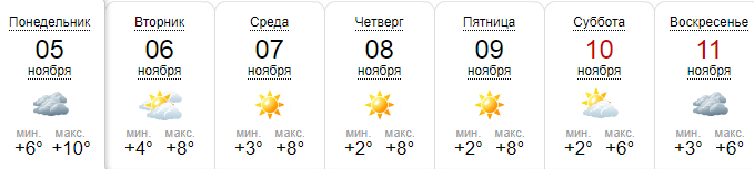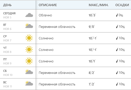 Сайт Weather.com обещает, что днем термометры покажут +9...+10, в понедельник пасмурно - далее переменная облачность и солнечная погода. На выходных +7...+8, переменная облачность, без осадков.