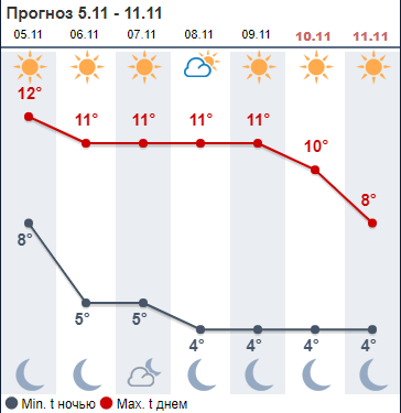 Сайт Gismeteо прогнозирует, что неделя будет солнечной, начиная со вторника. Дневная температура +8...+11, с четверга по субботу ночью она опустится до 0.