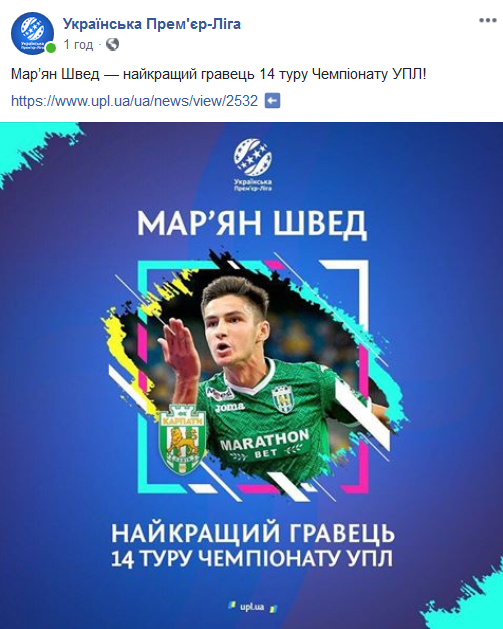 Им признали форварда львовских Карпат Марьяна Шведа, который отметился голом и сделал результативную передачу в выездном матче с Олимпиком и, таким образом, помог львовянам одержать важную победу.Об этом передает официальный Facebook УПЛ.