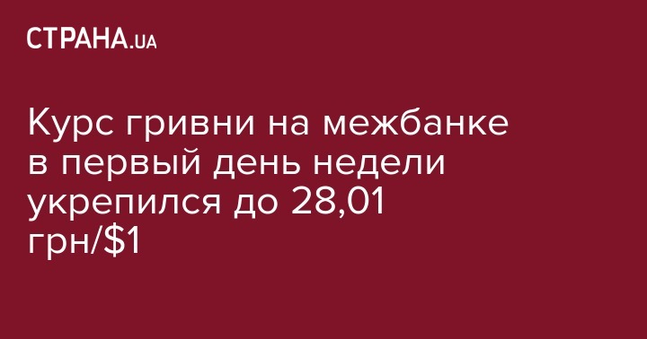 Курс гривни на межбанке в первый день недели укрепился до 28,01 грн/$1