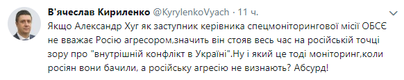 Вице-премьер-министр Украины Вячеслав Кириленко заявил, что экс-заместитель председателя Специальной мониторинговой миссии в Украине Александр Хуг все время на посту поддерживал российскую точку зрения о конфликте на Донбассе. Об этом он написал 5 ноября в Twitter.