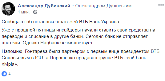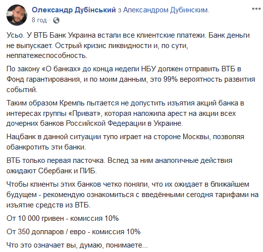 "У ВТБ-банк Украина стали все клиентские платежи. Банк деньги не выпускает. Острый кризис ликвидности и, по сути, неплатежеспособность. По закону "О банках" до конца недели НБУ должен отправить ВТБ в Фонд гарантирования вкладов, и по моим данным, это 99% вероятность развития событий.