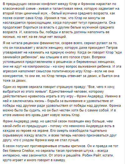 А Kate Popova отметила, что смерть Фрэнка Андервуда освободила тщательно скрываемую жажду власти, и всем теперь неловко признаваться друг другу, что с уходом Фрэнка мир не стал лучше.