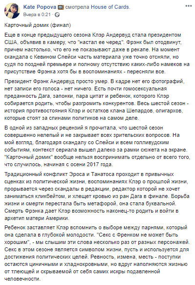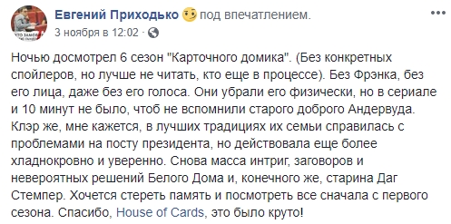 Журналист Евгений Приходько в восторге от последнего сезона – несмотря на отсутствие Спейси. "Ночью досмотрел 6 сезон "Карточного домика". (Без конкретных спойлеров, но лучше не читать, кто еще в процессе). Без Фрэнка, без его лица, даже без его голоса. Они убрали его физически, но в сериале и 10 минут не было, чтоб не вспомнили старого доброго Андервуда. Клэр же, мне кажется, в лучших традициях их семьи справилась с проблемами на посту президента, но действовала еще более хладнокровно и уверенно. Снова масса интриг, заговоров и невероятных решений Белого Дома и, конечного же, старина Даг Стемпер. Хочется стереть память и посмотреть все сначала с первого сезона. Спасибо, House of Cards, это было круто!"