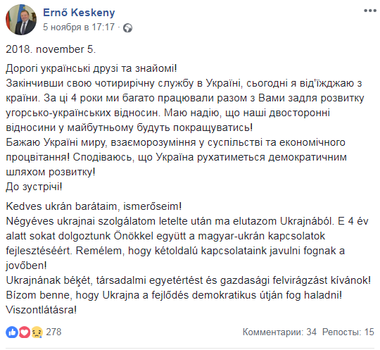 Закончив свою четырехлетнюю службу в Украине, сегодня я уезжаю из страны. За эти 4 года мы много работали вместе с Вами для развития венгерско-украинских отношений. Надеюсь, что наши двусторонние отношения в будущем будут улучшаться!