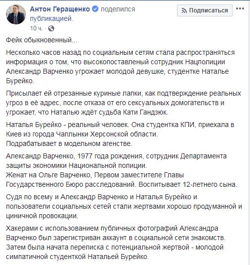 "Фейк обычный... Несколько часов назад из социальных сетей стала распространяться информация о том, что высокопоставленный сотрудник Нацполиции Александр Варченко угрожает молодой девушке, студентке Наталье Бурейко. Присылает ей отрезанные куриные лапки, как подтверждение реальных угроз в ее адрес, после отказа от его сексуальных домогательств, и угрожает, что Наталью ждет судьба Кати Гандзюк", - сообщил Геращенко.