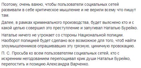 Он отметил, что впереди - в год выборов и борьбы за власть - будет не мало таких информационных провокаций. "Поэтому, очень важно, чтобы пользователи социальных сетей развивали в себе критическое мышление и не верили всему что пишут там", - добавил нардеп. "Далее, в рамках уголовного производства, будет выяснено, кто и с какой целью совершил это преступление и запугивал Наталья Бурейко. Натали ничего не угрожает со стороны Национальной полиции. Наоборот, полицией будет сделано все возможное для того, чтобы найти злоумышленников с этой грязной, циничной провокацией", - резюмировал Геращенко.