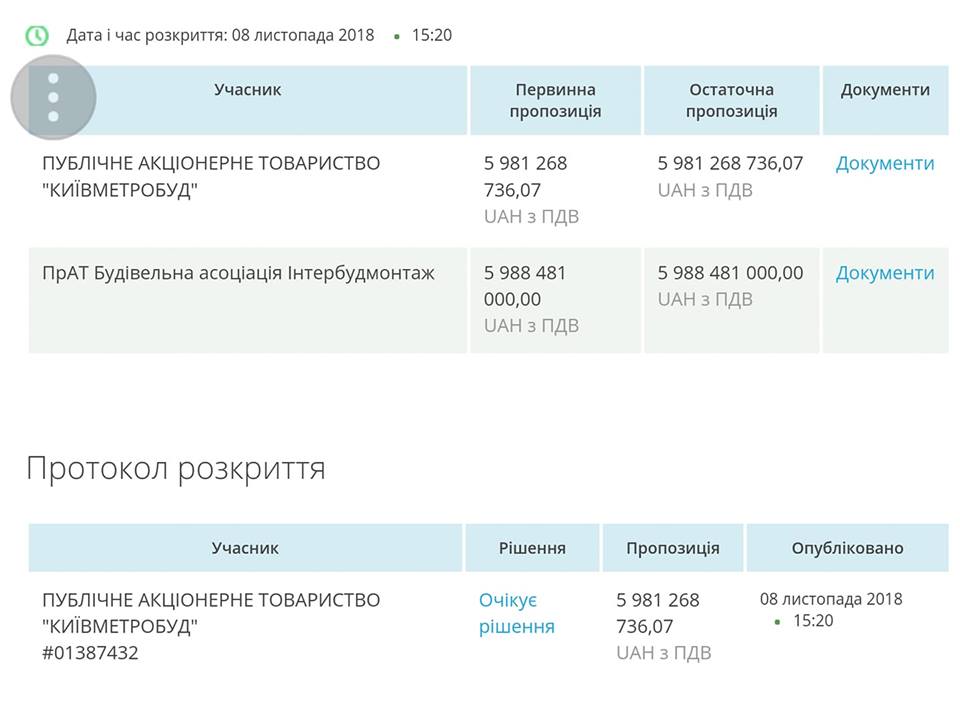 Согласно опубликованному в этом же сообщении скриншоту соответствующего аукциона с сайта Prozorro, "Киевметрострой" предложил выполнить указанные работы 5 млрд 981 млн 268 тыс. 736, 07 грн с НДС.