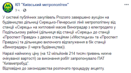 "В системе публичных закупок Prozorro завершился аукцион на строительство участка Сырецко-Печерской линии метрополитена от станции "Сырец" на жилой массив Виноградарь с электродепо в Подольском районе (участок от станции "Сырец" до станции "Проспект Правды" с двумя станциями ("Мостицкая" и "Проспект Правды") и участком вилочного ответвления в сторону станции "Виноградарь" (I очередь строительства))", - сообщается в четверг вечером на странице "Киевского метрополитена" в соцсети Facebook.