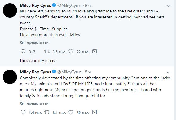 Так, лишилась дома популярная певица Майли Сайрус. Об этом звезда рассказала на своей странице в Twitter. По словам Сайрус, ее дом сгорел дотла, но ее домашние животные и "любовь ее жизни" вовремя ушли из дома. Певица отмечает, что это для нее самое главное, и у нее останутся воспоминания об этом месте. Также Сайрус поблагодарила пожарных и департамент шерифа, и призвала всех заинтересованных помочь пострадавшим от пожаров личным присутствием, деньгами или вещами.