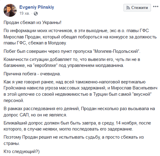 Далее журналист объясняет вероятные причины побега чиновника: "Над всей таможенно-налоговой вертикалью Гройсмана нависла угроза массовых задержаний, и Мирослав Васильевич в этой цепочке со своей недвижимостью в Турции был самой "вкусной" персоной. В рамках расследования его деяний, Продана несколько раз вызывала на допрос САП, но он не являлся.