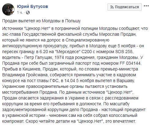 "Источники в пограничной полиции Молдовы сообщают, что экс-глава Государственной фискальной службы Мирослав Продан, который не явился на допрос в Специализированную антикоррупционную прокуратуру, прибыл в Молдову еще 5 ноября - он пересек границу в 6.20 на "Мерседесе" С200 с номером SDS 258, водитель - Петр Галущак, 1974 года рождения, гражданин Молдовы. У Продана при себе был заграничный паспорт под номером FF 034144", - сообщает Бутусов. По его данным, прибыв в Кишинев, Продан, который, по словам премьер-министра Владимира Гройсмана, собирается принимать участие в кадровом конкурсе на пост главы ГФС, в 14.04 5 ноября вылетел в Варшаву.