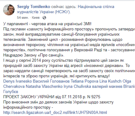 В парламенте началась очередная атака на украинские СМИ. Об этом в Facebook сообщили глава НСЖУ Сергей Томиленко.