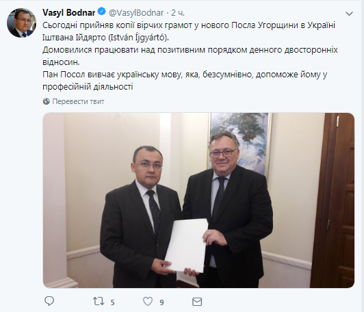 14 ноября новый посол Венгрии в Украине Иштван Ийдярто вручил копии верительных грамот заместителю Климкина Василию Боднару. Об этом заместитель главы МИД написал на своей странице в Twitter.