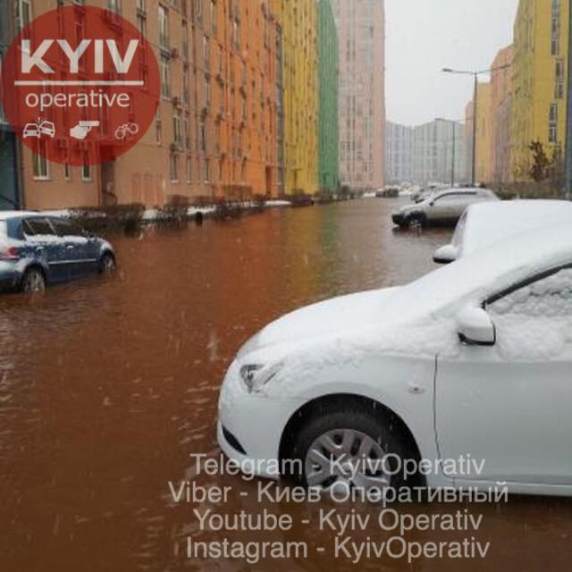 В Днепровском районе Киева затопило водой улицы во дворах жилого комплекса "Комфорт Таун" на улице Регенераторной. Об этом сообщают пользователи соцсетей.