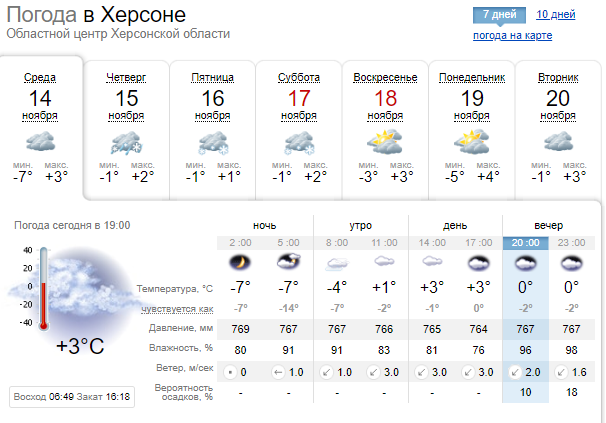 По прогнозу sinoptik.ua, в Херсоне ночью минимальная температура ночью достигала -7 градусов. Днем поднялась лишь до +3.
