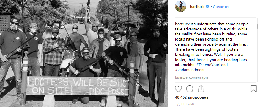 Харт разместил свое предупреждение в Instagram. Он выложил фото людей в масках, с оружием и знаком "Мародеры будут расстреляны на месте". "Если ты мародер, подумай дважды, прежде чем вернуться в Малибу", - подписал снимок Кэри Харт.