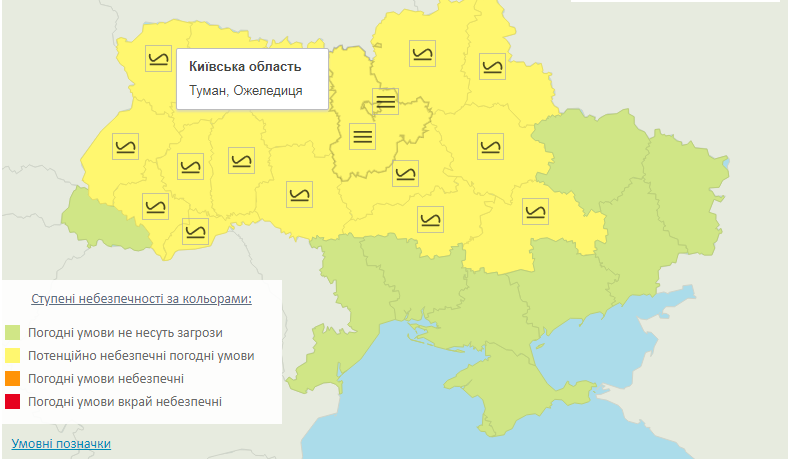 Отмечается, что такая ситуация может продержаться 3 часа и более. Также в Укргидрометцентре предупредили о гололеде.