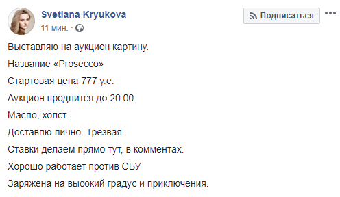 "...Название "Prosecco". Стартовая цена 777 у.е. Аукцион продлится до 20.00. Масло, холст. Доставлю лично. Трезвая. Ставки делаем прямо тут, в комментах. Хорошо работает против СБУ Заряжена на высокий градус и приключения", - сказано в подписи к посту.
