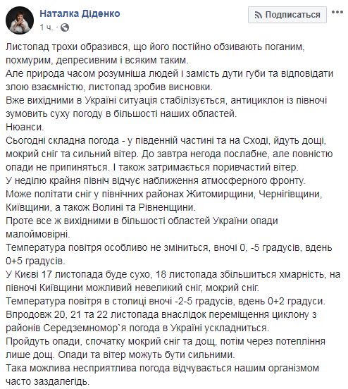 "Ноябрь немного обиделся за то, что его постоянно обзывают плохим, мрачным, депрессивным и всяким таким. Но природа порой умнее людей и вместо того, чтобы дуть губы и отвечать злой взаимностью, ноябрь сделал выводы", - пишет она, комментируя улучшение погоды на выходных. Она отмечает, что в большинстве областей Украины осадки маловероятны.