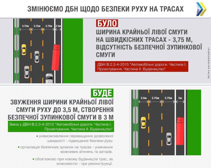 Там отмечают, что сейчас на трассах предусмотрена единая ширина полос движения 3,75 метров и остановочная полоса в 2,5 метра, что является опасной шириной для остановки, например, грузового автомобиля. "Поэтому теперь при строительстве трасс планируем предусмотреть обязательное сужение крайней левой полосы для скоростного движения легкового транспорта и расширение остановочной полосы. Это сделает невозможным превышение разрешенной скорости на дорогах и будет способствовать повышению безопасности движения", - говорится в сообщении.