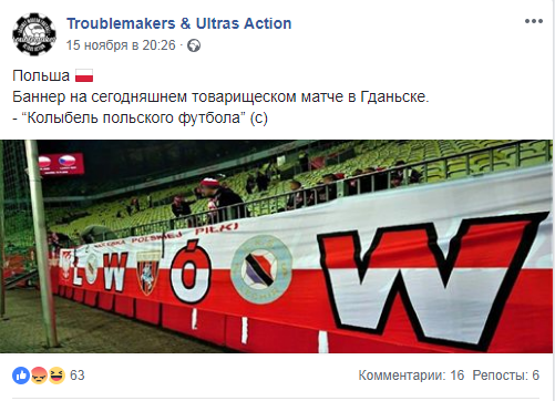 Украинские поклонники футбола не остались у них в долгу и уже на следующий день, 16 ноября, во время игры против сборной Словакии в Лиге наций (1:4), они вывесили украинский флаг с изображением нашего герба и названием польского города Хелм. Они, очевидно, напоминали фанатам сборной Польши, что и часть их территории когда-то была в составе Галичины.