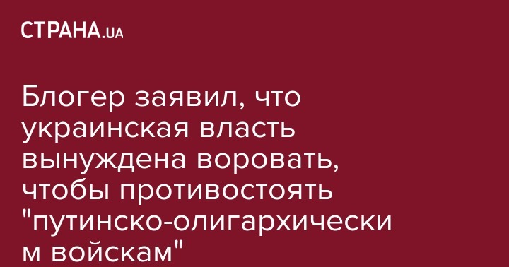 Блогер заявил, что украинская власть вынуждена воровать, чтобы противостоять "путинско-олигархическим войскам"