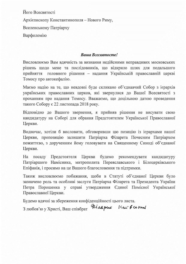 Также патриарх Филарет в письме оговорил условия снятия своей кандидатуры: сохранение за собой статуса почетного патриарха, председательство в Синоде новой Церкви и выдвижение единого кандидата от Киевского патриархата – митрополита Епифания (Думенко).