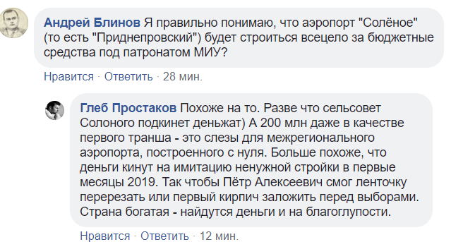 Другие комментаторы обращают внимание на то, что не мешало бы сначала таки достроить аэропорт в Запорожье: "Странное решение, как по мне. В Запорожье свой аэропорт достраивают. Полоса уже готова, новый терминал активно строится. Пассажиро поток растет. А в Днепре проще построить новый терминал и реконструировать полосу. А Коломойский пусть Старый терминал хоть себе в ж...пу засунет. Хотя если действительно построят, наконец-то, это будет супер. А то из Днепра не улететь не уехать..."