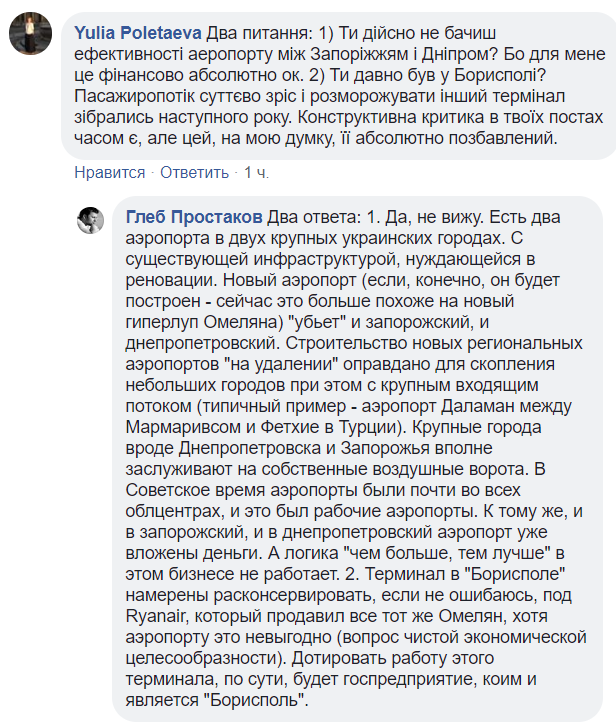 "Есть два аэропорта в двух крупных украинских городах. С существующей инфраструктурой, нуждающейся в реновации. Новый аэропорт (если, конечно, он будет построен - сейчас это больше похоже на новый гиперлуп Омеляна) "убьет" и запорожский, и днепропетровский. Строительство новых региональных аэропортов "на удалении" оправдано для скопления небольших городов при этом с крупным входящим потоком (типичный пример - аэропорт Даламан между Мармаривсом и Фетхие в Турции). Крупные города вроде Днепропетровска и Запорожья вполне заслуживают на собственные воздушные ворота. В Советское время аэропорты были почти во всех облцентрах, и это был рабочие аэропорты. К тому же, и в запорожский, и в днепропетровский аэропорт уже вложены деньги. А логика "чем больше, тем лучше" в этом бизнесе не работает".