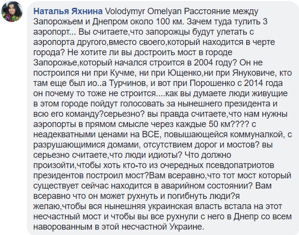 "Расстояние между Запорожьем и Днепром около 100 км. Зачем туда тулить 3 аэропорт... Вы считаете,что запорожцы будут улетать с аэропорта другого, вместо своего,который находится в черте города? Не хотите ли вы достроить мост в городе Запорожье, который начался строится в 2004 году? Он не построился ни при Кучме, ни при Ющенко, ни при Януковиче, кто там еще был ио Турчинов, и вот при Порошенко с 2014 года он почему то тоже не строится.... Как вы думаете люди живущие в этом городе пойдут голосовать за нынешнего президента и всю его команду? Серьезно? Вы правда считаете, что нам нужны аэропорты в прямом смысле через каждые 50 км? С неадекватными ценами на ВСЕ, повышающейся коммуналкой, с разрушающимися домами, отсутствием дорог и мостов? Вы серьезно считаете,что люди идиоты?", - пишет жительница Запорожья Наталья Яхнина.