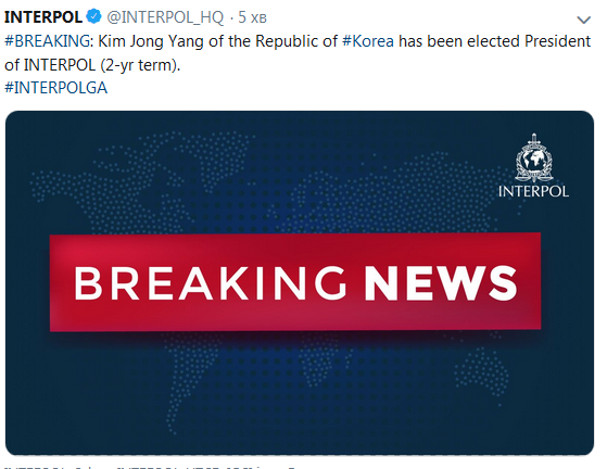 Сегодня, 21 ноября, прошли выборы нового главы Интерпола. Им стал не российский генерал-майор Александр Прокопчук, а представитель Южной Кореи Ким Чонгчанг. Именно он избран на пост главы Интерпола. Об этом сообщает официальный Twitter международной полиции.