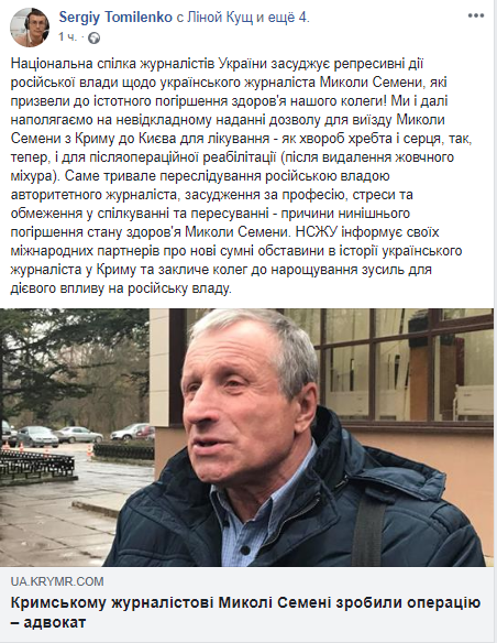 "Именно длительное преследование российской властью авторитетного журналиста, осуждение за профессию, стрессы и ограничения в общении и передвижении - причины нынешнего ухудшения состояния здоровья Николая Семены", - пишет глава НСЖУ.
