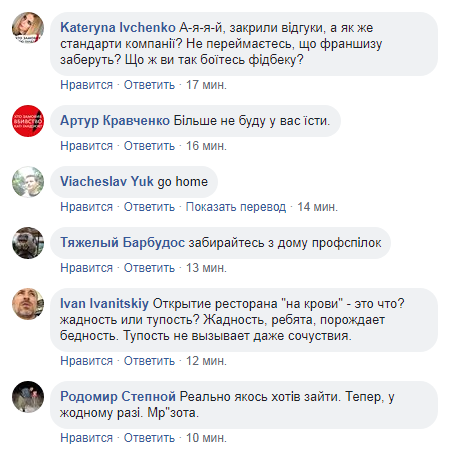 Невозможность оставить отзыв не остановила пользователей Facebook. Они оставляют десятки гневных комментариев под последними публикациями на странице. Большая часть из них содержат призывы бойкотировать рестораны этой сети - как онлайн, так и офлайн.