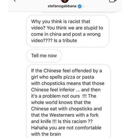 После этого в соцсетях появились скриншоты переписки некоего пользователя с якобы Стефано Габбано, который заявляет, что абсолютно не считает ролики расистскими и что все знают, что в Китае едят палочками, а на западе ножом и вилкой и в этом нет ничего оскорбительного. А если кто-то усмотрел в этом насмешку, то это не проблемы модного дома.