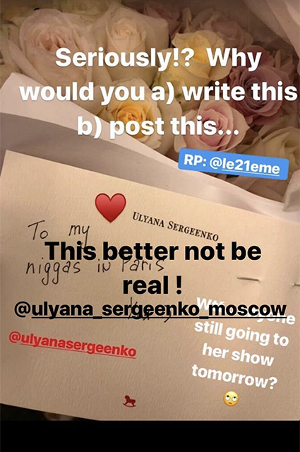 Неприятная история случилась и с российским дизайнером Ульяной Сергеенко. Ее и ее подругу Мирославу Думу также обвинили в расизме.  Дума опубликовала в своем Instagram-аккаунте приглашение на модный показ Ульяны Сергеенко. В приглашении была фраза "To my niggas in Paris", что можно перевести как "Моим ниггерам в Париже". Сергеенко потом говорила, что это была ироничная цитата из песни Канье Уэста.
